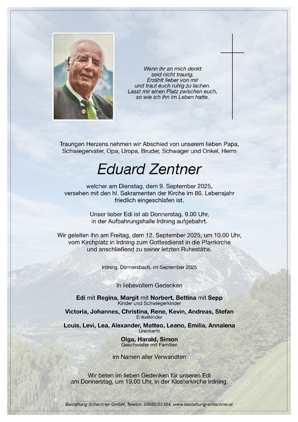 Aufbahrung ab Donnerstag, 9.00 Uhr, in der Aufbahrungshalle Irdning. Begräbnis am Freitag, dem 12.9.2025 um 10.00 Uhr in Irdning.