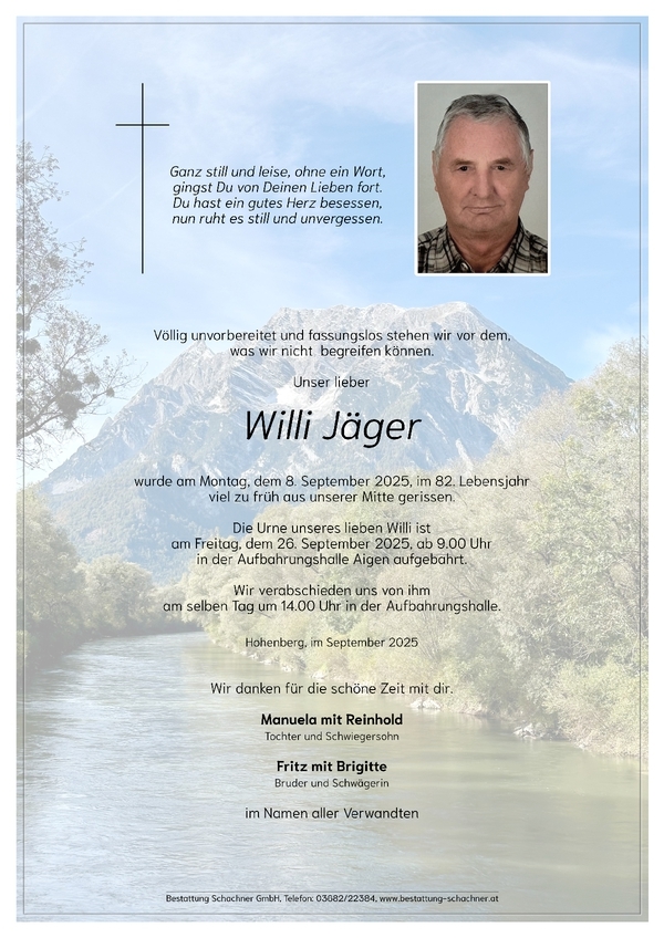 Aufbahrung der Urne am Freitag, dem 26.9.2025 ab 9 Uhr in der Aufbahrungshalle Aigen. Trauerfeier am selben Tag um 14 Uhr in der Aufbahrungshalle.