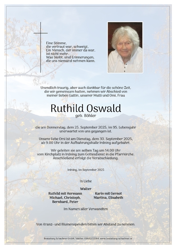 Aufbahrung am Dienstag, dem 30.9.2025 ab 9 Uhr in der Aufbahrungshalle Irdning. Verabschiedung am selben Tag um 14 Uhr in Irdning.