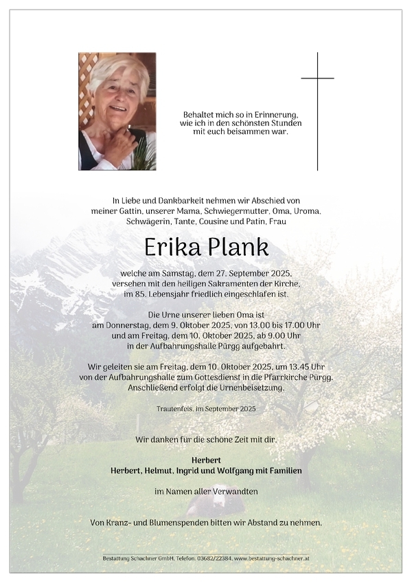 Aufbahrung am Donnerstag, 9.10.2025 von 13-17 Uhr sowie am Freitag, dem 10.10.2025 ab 9 Uhr in der Aufbahrungshalle Pürgg. Urnenbegräbnis am Freitag, 10.10.2025 um 13.45 Uhr in Pürgg.