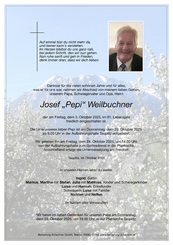 Aufbahrung der Urne am Donnerstag, dem 23.10.2025 ab 9 Uhr in der Aufbahrungshalle Tauplitz. Urnenbegräbnis am Freitag, dem 24.10.2025 um 14 Uhr in Tauplitz.