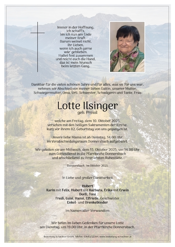 Aufbahrung am Dienstag, ab 14.00 Uhr, im Verabschiedungsraum Donnersbach. Begräbnis am Mittwoch, dem 15.10.2025 um 14 Uhr in Donnersbach.