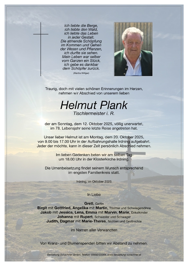 Aufbahrung am Montag, dem 20.10.2025 von 9-17 Uhr in der Aufbahrungshalle Irdning. Betstunde am selben Tag um 18 Uhr in der Klosterkirche Irdning.