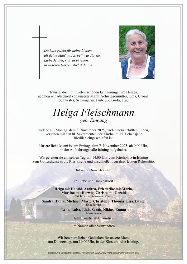 Aufbahrung am Freitag, dem 7.11.2025 ab 9 Uhr in der Aufbahrungshalle Irdning. Begräbnis am selben Tag um 14 Uhr in Irdning.