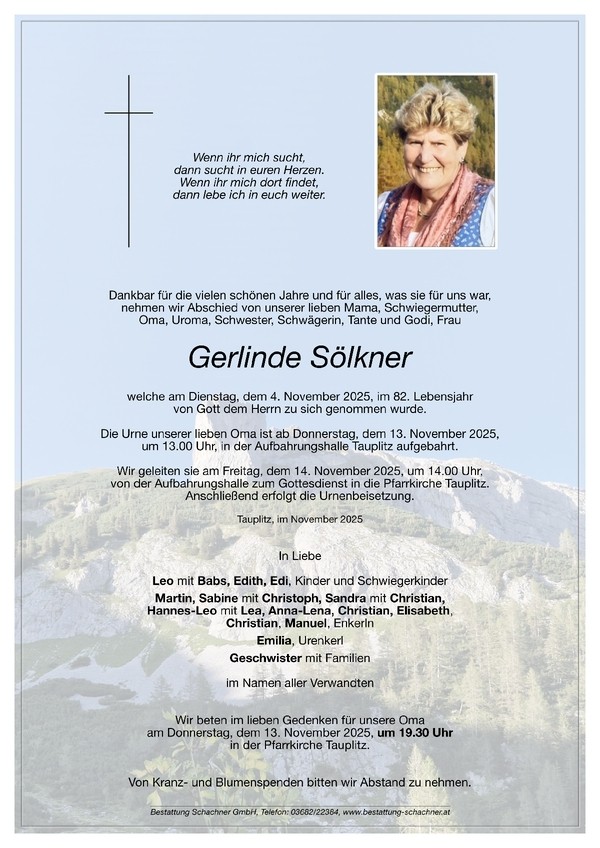 Aufbahrung der Urne ab Donnerstag, 13.11.2025, um 13 Uhr in der Aufbahrungshalle Tauplitz. Urnenbegräbnis am Freitag, dem 14.11.2025 um 14 Uhr in Tauplitz.