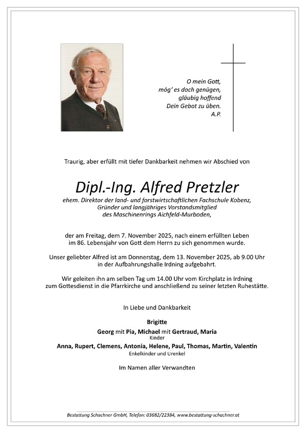 Aufbahrung am Donnerstag, dem 13. November 2025, ab 9 Uhr in der Aufbahrungshalle Irdning. Begräbnis am selben Tag um 14 Uhr in Irdning.
