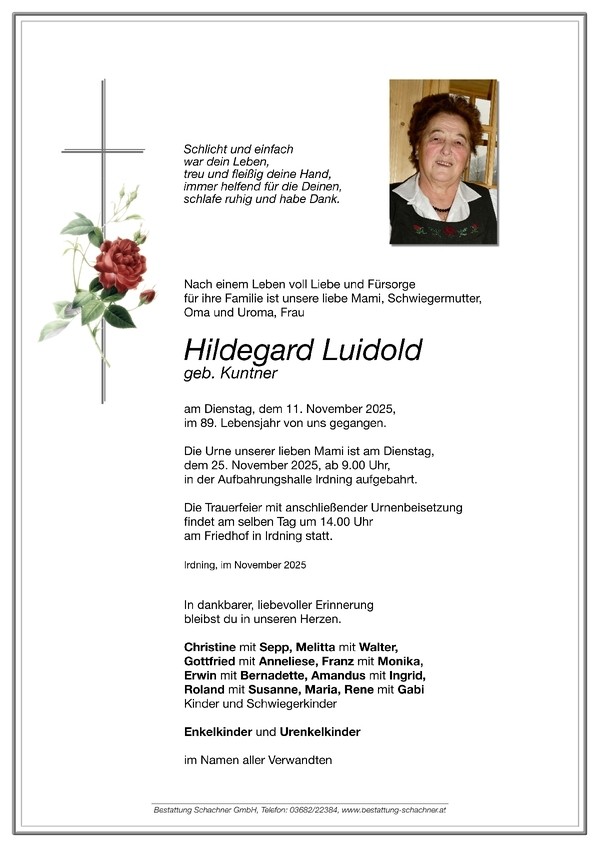 Aufbahrung der Urne am Dienstag, dem 25.11.2025 ab 9 Uhr in der Aufbahrungshalle Irdning. Trauerfeier und anschließende Urnenbeisetzung am selben Tag um 14 Uhr am Friedhof in Irdning.