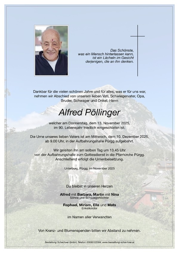 Aufbahrung der Urne am Mittwoch, dem 10.12.2025 ab 9 Uhr in der Aufbahrungshalle Pürgg. Urnenbegräbnis am selben Tag um 13.45 Uhr in Pürgg.