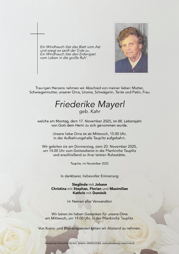 Aufbahrung am Mittwoch, ab 15 Uhr, in der Aufbahrungshalle Tauplitz. Begräbnis am Donnerstag, dem 20.11.2025 um 14 Uhr in Tauplitz.