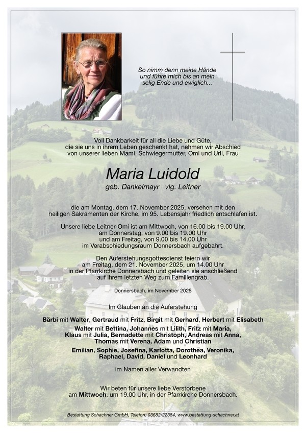 Aufbahrung ab Mittwoch, 16 Uhr, im Verabschiedungsraum Donnersbach. Begräbnis am Freitag, dem 21.11.2025 um 14 Uhr in Donnersbach.