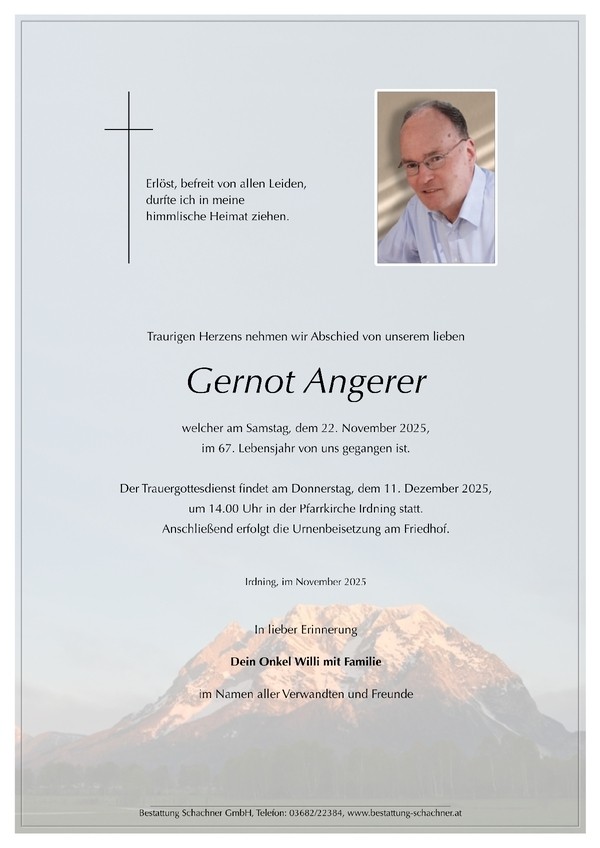 Der Trauergottesdienst findet am Donnerstag, dem 11.12.2025 um 14 Uhr in der Pfarrkirche Irdning statt.