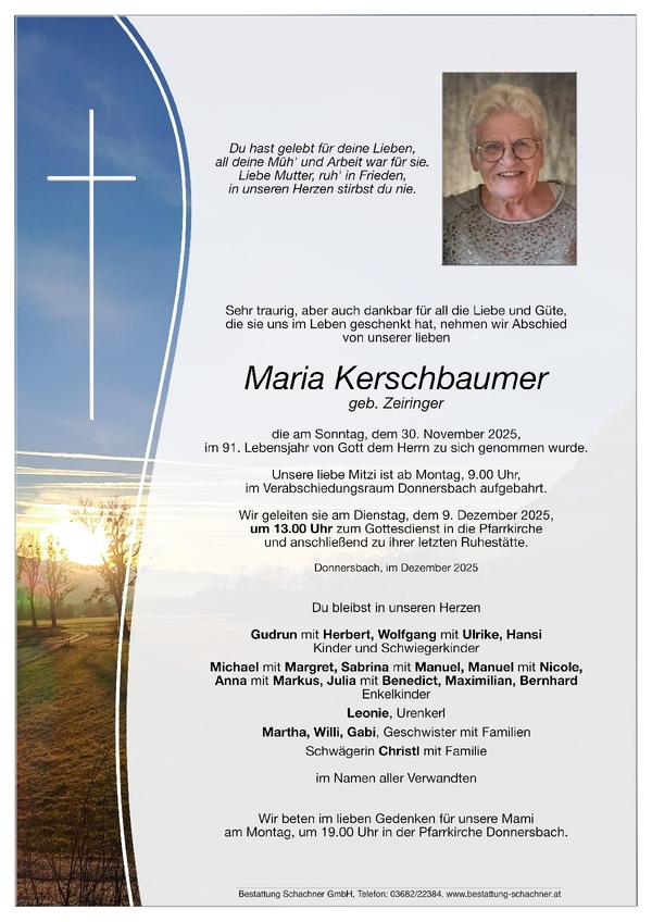 Aufbahrung ab Montag, 9 Uhr, im Verabschiedungsraum Donnersbach. Begräbnis am Dienstag, dem 9.12.2025 um 13 Uhr in Donnersbach.