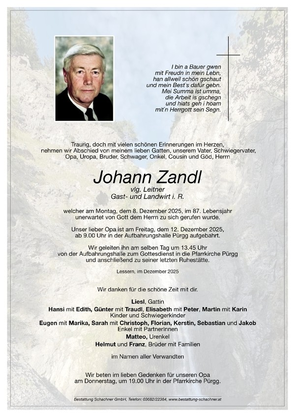 Aufbahrung am Freitag, dem 12.12.2025 ab 9 Uhr in der Aufbahrungshalle Pürgg. Begräbnis am selben Tag um 13.45 Uhr in Pürgg.