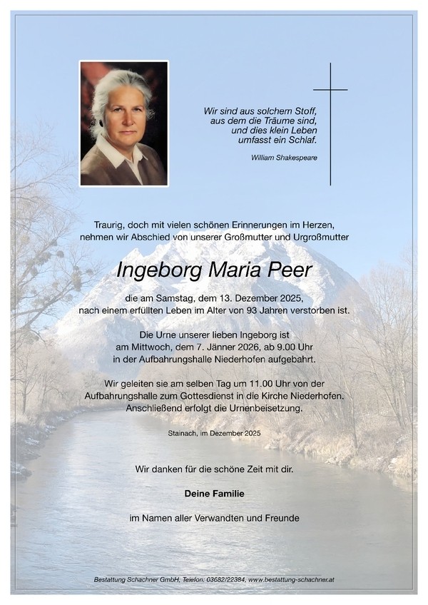 Aufbahrung der Urne am Mittwoch, dem 7.1.2026 ab 9 Uhr in der Aufbahrungshalle Niederhofen. Urnenbegräbnis am selben Tag um 11 Uhr in Niederhofen.