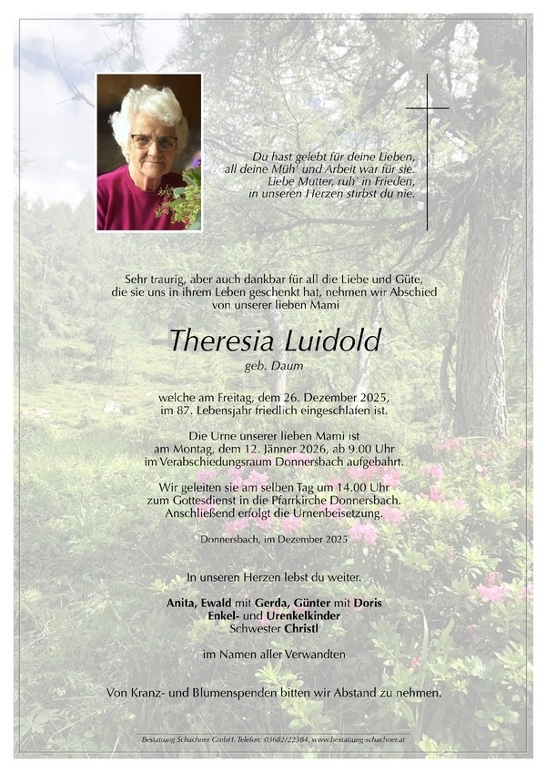Aufbahrung der Urne am Montag, dem 12.01.2026 ab 9 Uhr im Verabschiedungsraum Donnersbach. Urnenbegräbnis am selben Tag um 14 Uhr in Donnersbach.