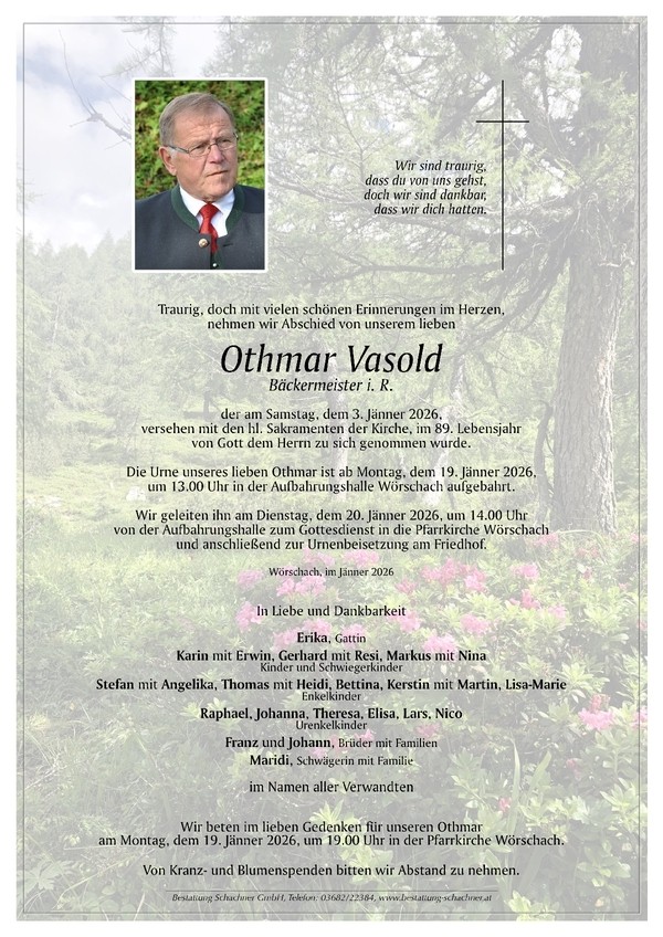 Aufbahrung der Urne ab Montag, 19.1.2026 um 13 Uhr in der Aufbahrungshalle Wörschach. Urnenbegräbnis am Dienstag, dem 20.1.2026 um 14 Uhr in Wörschach.
