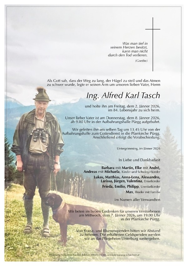 Aufbahrung am Donnerstag, dem 8.1.2026 ab 9 Uhr in der Aufbahrungshalle Pürgg. Verabschiedung am selben Tag um 13.45 Uhr in Pürgg.