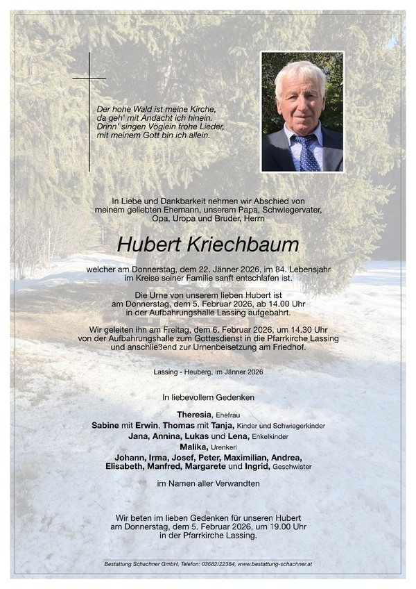 Aufbahrung der Urne am Donnerstag, dem 5.2.2026 ab 14 Uhr in der Aufbahrungshalle Lassing. Urnenbegräbnis am Freitag, dem 6.2.2026 um 14:30 Uhr in Lassing.