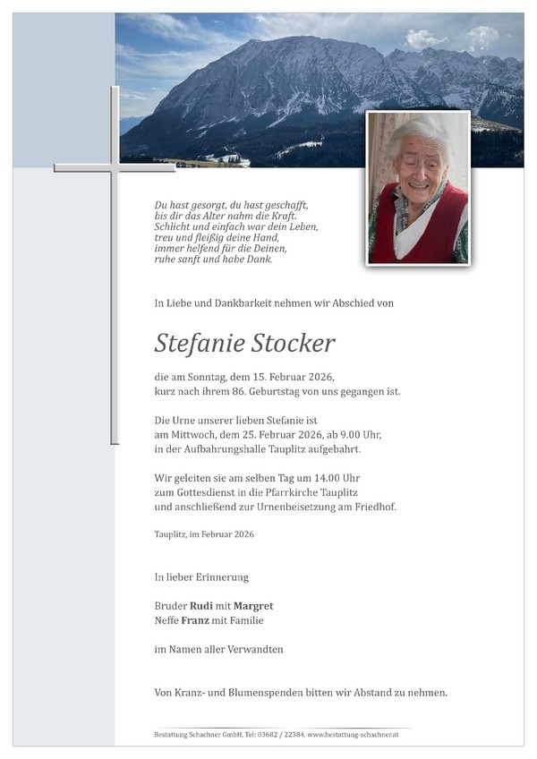 Aufbahrung der Urne am Mittwoch, dem 25.2.2026 ab 9 Uhr in der Aufbahrungshalle Tauplitz. Urnenbegräbnis am selben Tag um 14 Uhr in Tauplitz.