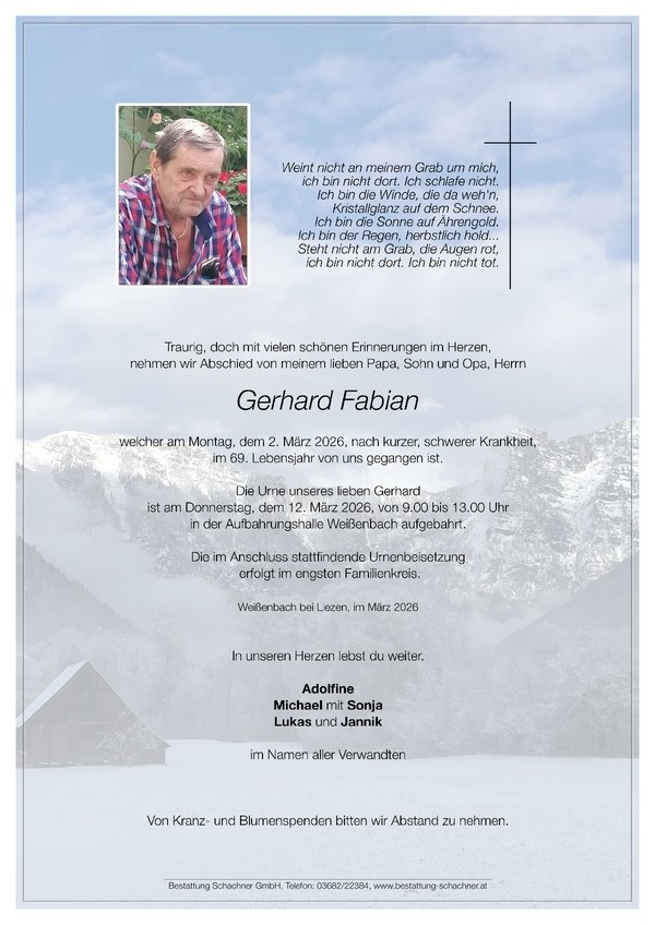 Aufbahrung der Urne am Donnerstag, dem 12.3.2026 von 9-13 Uhr in der Aufbahrungshalle Weißenbach.