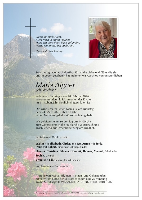 Aufbahrung der Urne am Dienstag, dem 24.3.2026 ab 9 Uhr in der Aufbahrungshalle Wörschach. Urnenbegräbnis am selben Tag um 14 Uhr in Wörschach.