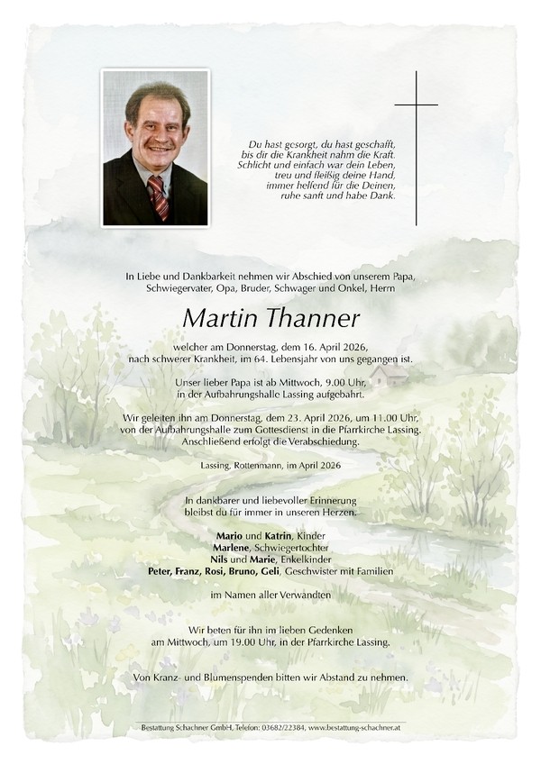Aufbahrung ab Mittwoch in der Aufbahrungshalle Lassing. Verabschiedung am Donnerstag, dem 23.4.2026 um